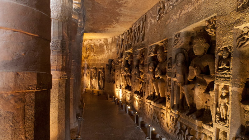 In mattinata visita alle grotte di Ellora (Patrimonio Mondiale dell’Umanità), che rappresentano uno splendido esempio dell’ arte scultorea indiana. Per intere generazioni monaci buddisti, hindu e giainisti scavarono templi e monasteri ornandoli con decorazioni di rara bellezza. Vi sono 34 grotte : 12 buddhiste, 17 hindu e 5 giainiste, scolpite nel 3° secolo sul pendio di una piccola collina e perfettamente cesellate nella roccia. Ritorno a Aurangabad per il pernottamento.